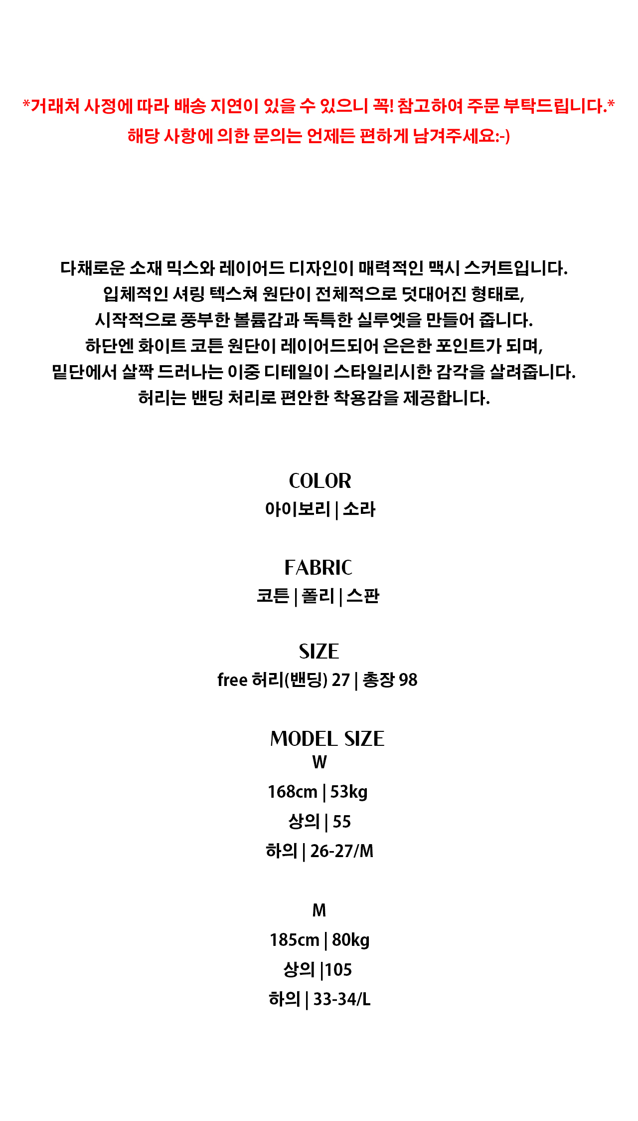 - 1:1오더 시스템으로 재고를 쌓아두지 않고 판매하고 있어 당일 배송은 불가능합니다.