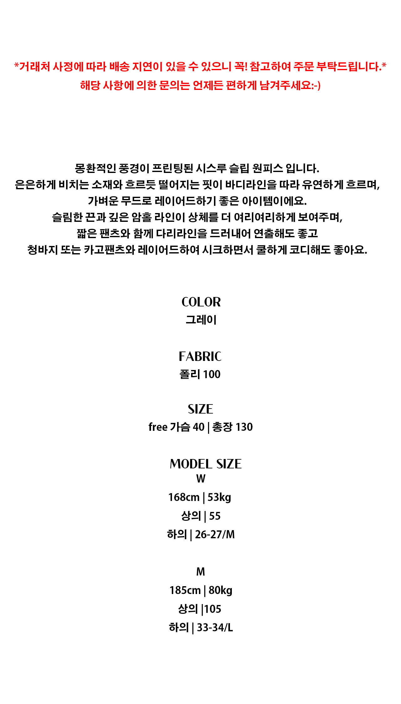 - 1:1오더 시스템으로 재고를 쌓아두지 않고 판매하고 있어 당일 배송은 불가능합니다.
