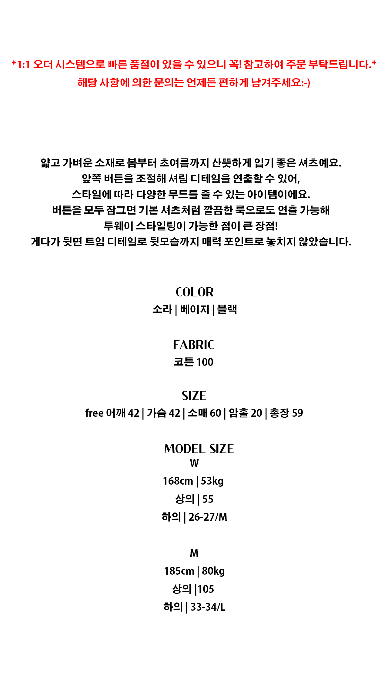 - 1:1오더 시스템으로 재고를 쌓아두지 않고 판매하고 있어 당일 배송은 불가능합니다.