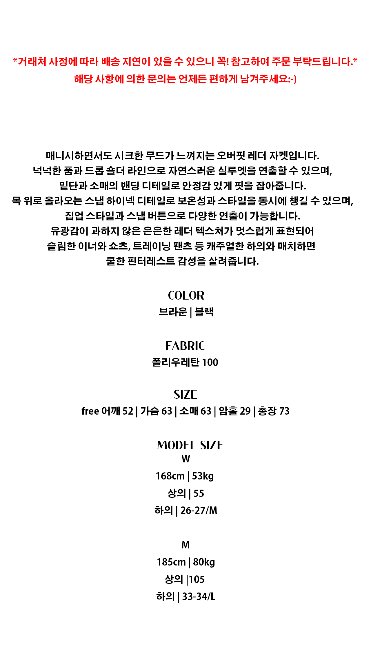 - 1:1오더 시스템으로 재고를 쌓아두지 않고 판매하고 있어 당일 배송은 불가능합니다.